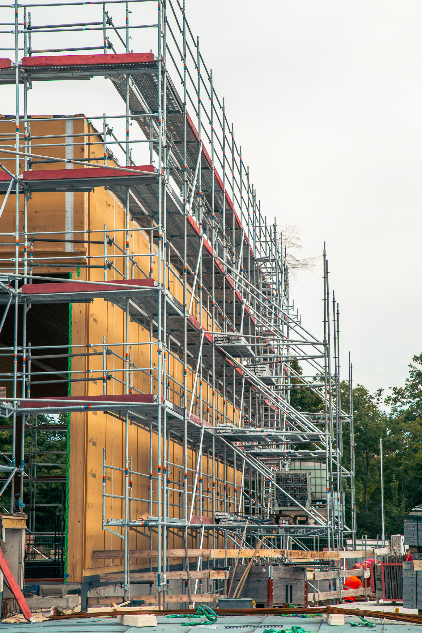 In Steffisburg entsteht derzeit die neue Schul-, Kultur- und Sportanlage Schönau. Das Projekt umfasst eine Dreifachturnhalle, ein Kunstrasenfeld, großzügige Außenanlagen sowie eine Einstellhalle mit integrierter Zivilschutzanlage. Die Fertigstellung ist für 2026 geplant. Die Gerüstebau Schwarzenbach AG übernimmt sämtliche Gerüstbauarbeiten – darunter Außengerüste mit Auffangnetzen, Innengerüste und Treppenhausrüstungen mit insgesamt rund 3000 m² Gerüstfläche. Eine besondere Herausforderung stellte die Fassade dar: Hier musste eine komplett freistehende Konstruktion ohne Verankerungen errichtet werden. Erstmals setzte das Unternehmen dabei auf das SUPER‑RS Fassadengerüstsystem von Scafom‑rux. Laut Geschäftsführer Haidar Al‑Awsi überzeugte das modulare System durch seine hohe Anpassungsfähigkeit und die Erfüllung der aktuellen Schweizer Sicherheitsanforderungen, insbesondere beim vorlaufenden Geländer ab 2 m Arbeitshöhe. Die Einarbeitung verlief trotz Systemneuheit problemlos – unterstützt durch die vorhandene Erfahrung mit Modulgerüsten und die gute Zusammenarbeit mit Scafom‑rux. Ein wesentlicher Entscheidungsgrund für SUPER‑RS war das erhöhte Sicherheitsniveau: Das vorlaufende Geländer ermöglicht Arbeiten ohne PSAgA und erleichtert damit den gesamten Baustellenablauf. Auch die leichtere Handhabung der Einzelbauteile im Vergleich zu starren Rahmen wurde positiv hervorgehoben. Die geplante Standzeit der Gerüste beträgt sechs Monate. Der Aufbau erfolgte innerhalb von sechs Wochen durch ein Team von drei bis sechs Monteuren. Für Haidar Al‑Awsi hat das Projekt zudem eine persönliche Note – sein Sohn wird die neue Sportanlage künftig selbst nutzen. Die Gerüstebau Schwarzenbach AG aus Gwatt (Thun) ist seit über 50 Jahren im Kanton Bern aktiv und steht für zuverlässige Umsetzung und kundenorientierte Lösungen im klassischen Gerüstbau.